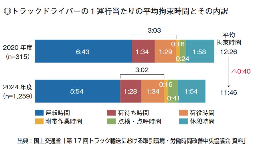 トラックドライバーの拘束時間の内訳 荷待ち+荷役が3時間近く占めている